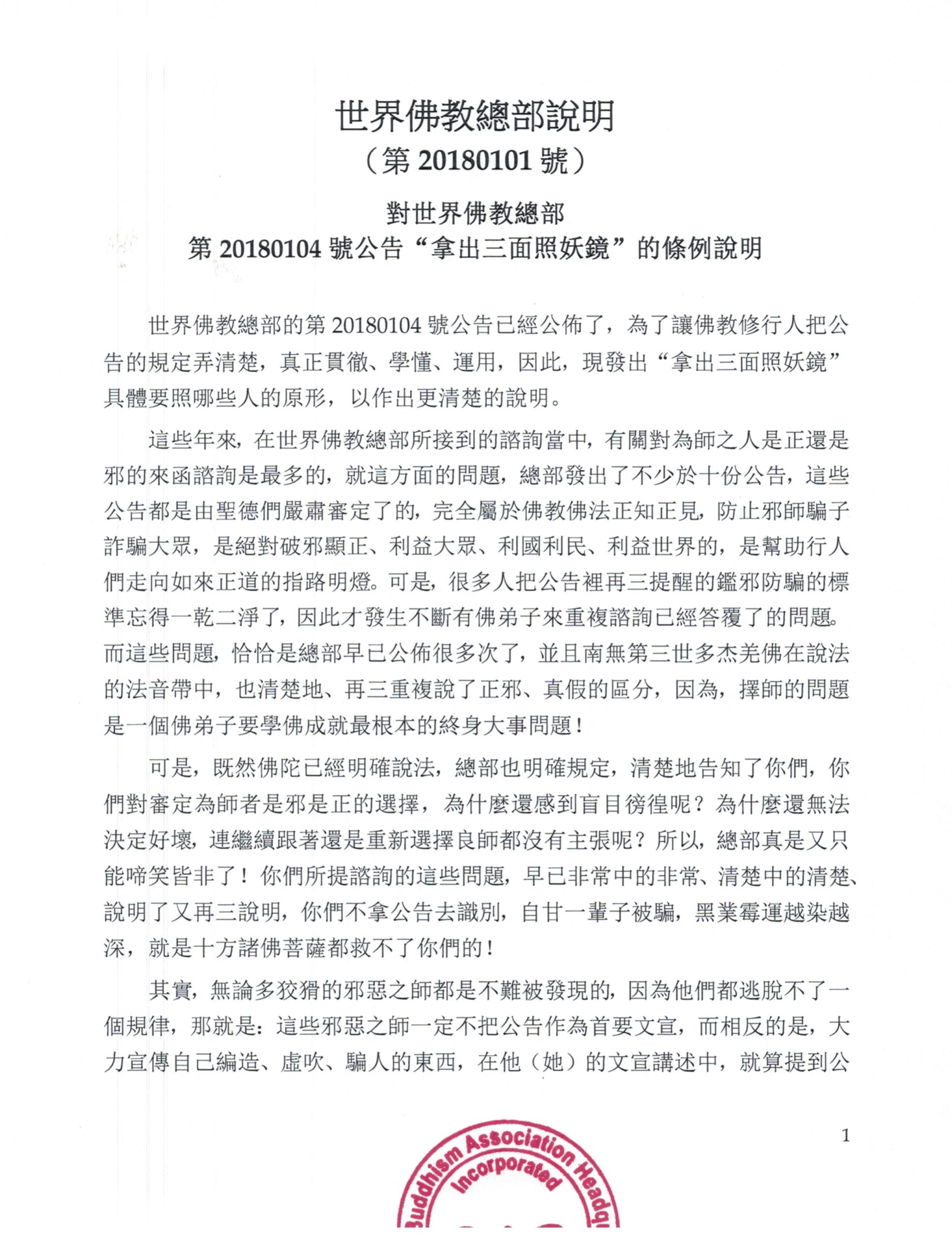 世界佛教總部說明 (第20180101號) 對世界佛教總部 第20180104號公告“拿出三面照妖鏡”的條例說明