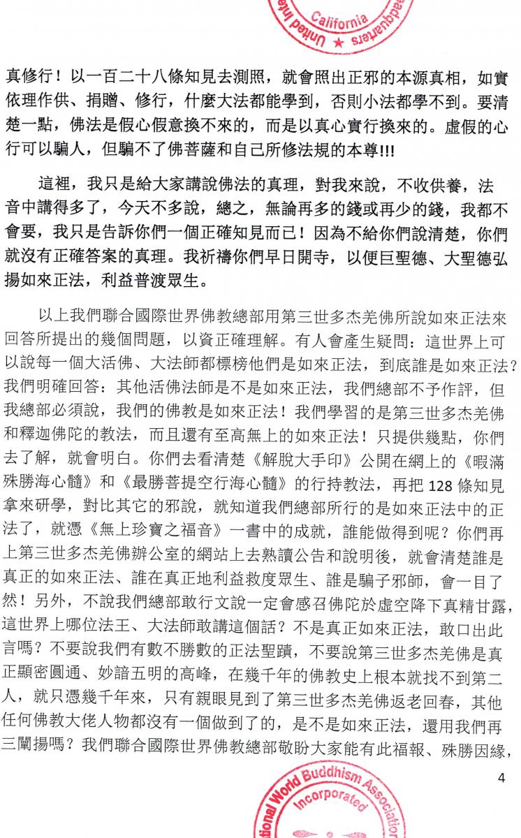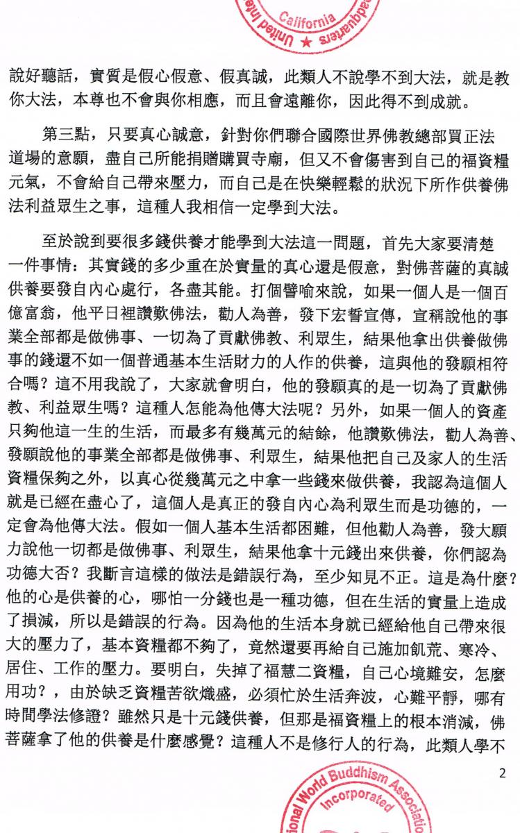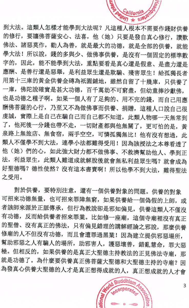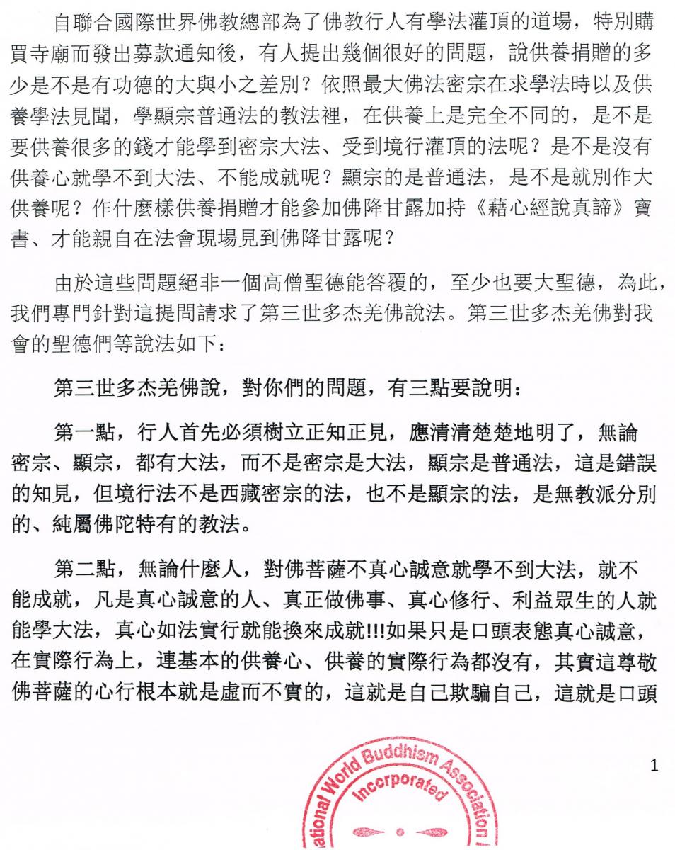 世界佛教總部公告 第20170111號 – 正確答覆大悲觀音加持法和內密