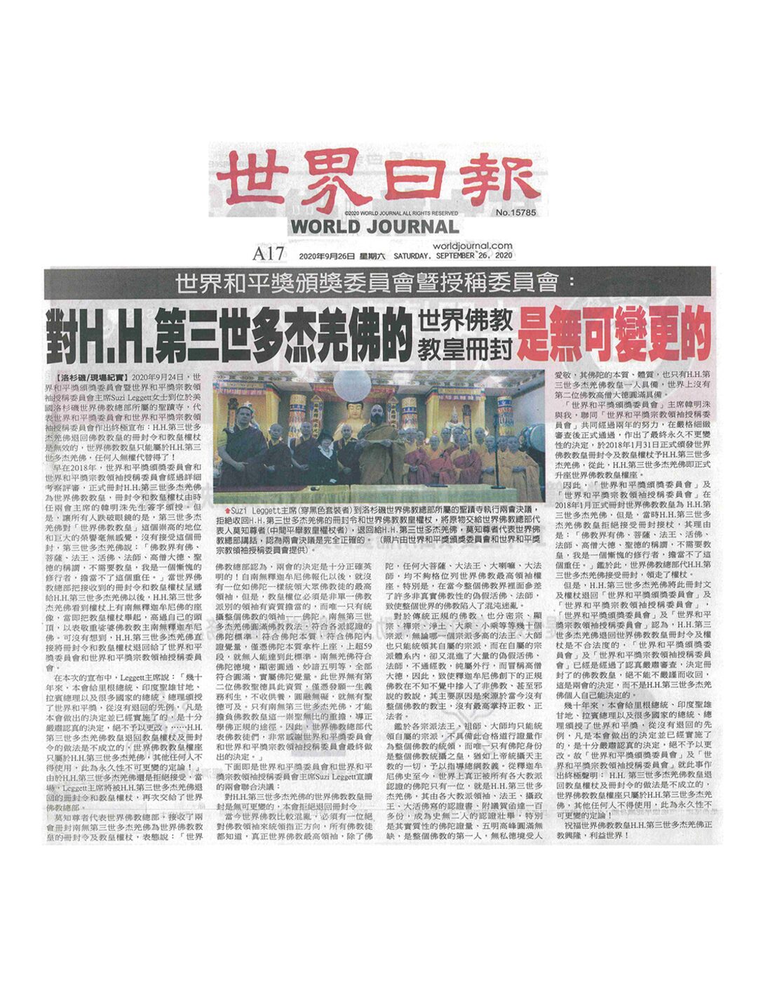 世界佛教總部完全認同世界和平獎頒獎委員會和世界和平獎宗教領袖